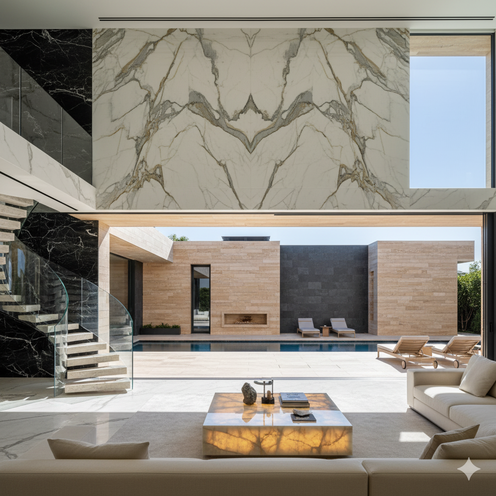 Mimari Uygulamalar: Yapılarınızın sıradanlığa karşı fark yaratmasını istiyorsanız, 1500 e yakın doğal taşın çeşidiyle her birinin kendine has damar, desen ve doku farkıyla aynı zamanda masif yapısıyla tasarımın ve dekorasyonun sınırı sadece hayal gücünüze kalacaktır. Basamak mermeri, Döşeme mermeri, Duvar kaplama, Bookmatch kaplama, Havuz kenarı,